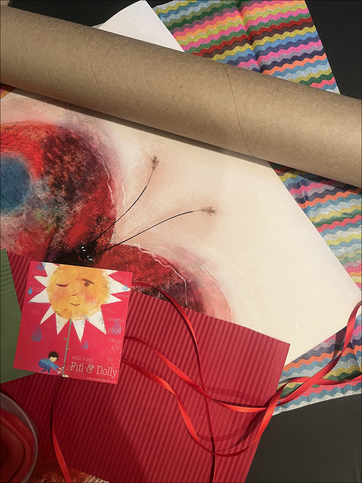 Inside either the envelope or the tube, prints are contained within tissue paper and wrapped again in craft paper.